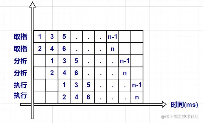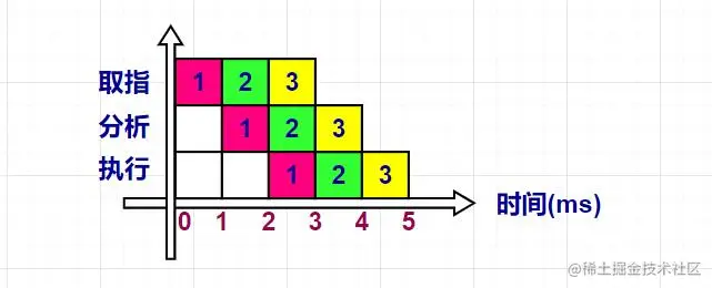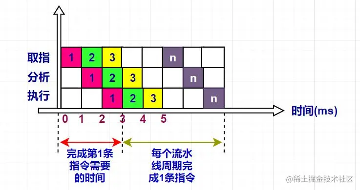 从另一个角度,我们发现执行完第一条指令时,需要3ms,执行完第二条指令时,只需要在执行完第一条指令的基础上增加1ms。同样的,执行完第三条指令时,只需要在执行完第二条指令的基础上增加1ms。以后每增加一条指令,只需要增加1ms的时间便可以执行完此条指令。