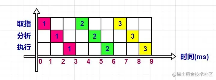 此时,我们发现,在上图执行指令操作的过程中,有很多空白的格子,而空白的格子表示在执行执行的过程中有空余的时间片资源没有利用起来。很显然,没有必要等待指令1完全执行完毕后再执行指令2,同样的,没有必要等待指令2完全执行完毕后再执行指令3。而且,我们发现按照上图执行完三条指令需要9ms时间。