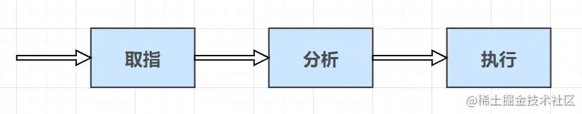 在计算机中,对于指令的操作主要分为三个部分:取指、分析和执行。如下所示。