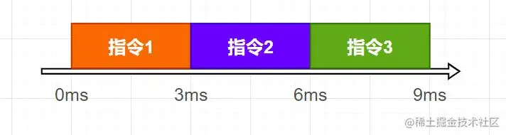 在上图的表示中,貌似执行三条指令使用9ms是没啥问题的。但是,如果我们把图形改造一下,我们就会发现相应的问题。我们使用下面的图形来表示执行三条指令的情况。