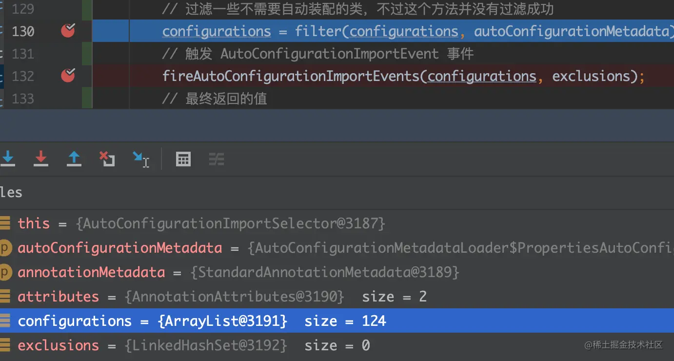 configurations:自动装配类,已经去除了需要排除的类exclusions:通过@EnableAutoConfiguration指定的需要排除的类