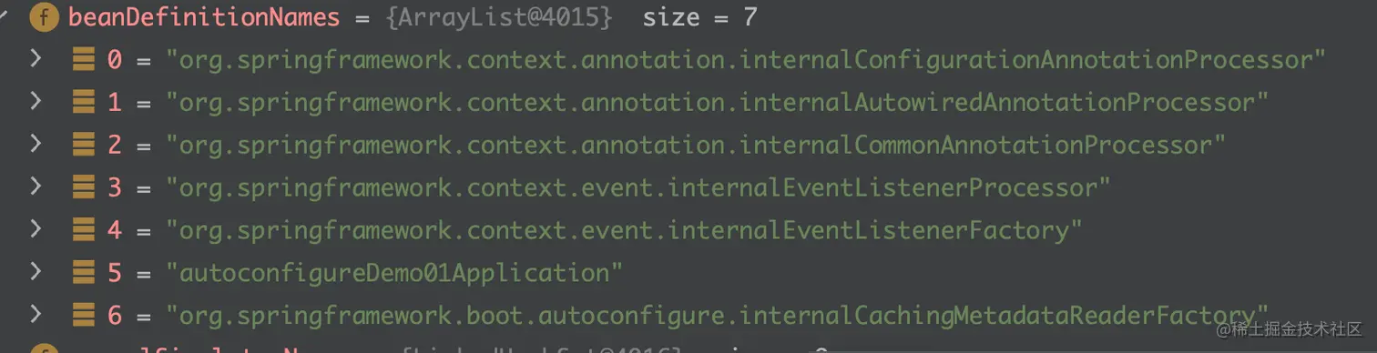 在【springboot源码分析】@SpringBootApplication 注解一文中,我们提到SpringBootApplication 注解中的@ComponentScan 会指定一个过滤器:AutoConfigurationExcludeFilter,这个过滤器会过滤自动装配类,这里我们看下目前为止beanFactory都有哪些beanName: