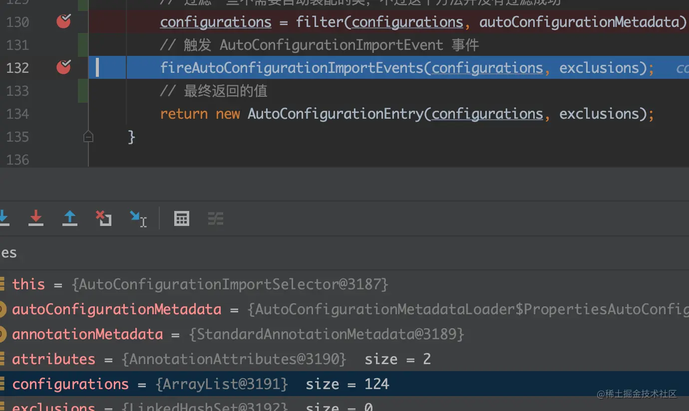 autoConfigurationEntries,然后通过autoConfigurationEntry#getExclusions方法得到的 ,前面我们也提到过,autoConfigurationEntry只包含两个成员变量:configurations(去除排除类后的自动装配类) 与exclusions(通过@EnableAutoConfiguration指定的排除类); -