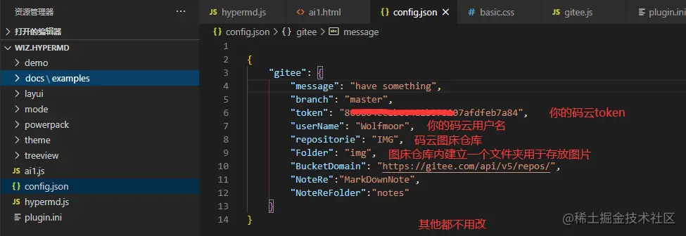 **一般用户可以忽略此步骤:**根据你是否使用码云图床修改配置文件:config.json。如果不用码云则不用修改,图片会默认上传到wiz 。如果用码云,那么下图中的"imgToWiz"必须配置为false,且"gitee"中的配置按照图中修改