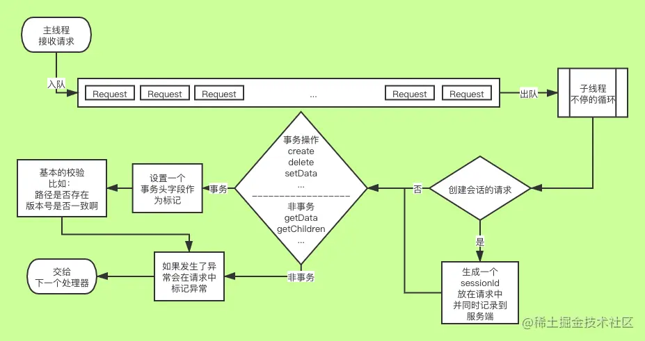 在这里我小小的剧透下,以上的场景实际是 ZK 单机版的处理场景,如果换成了集群版会在该链条中加入更多的处理器,之后会涉及到集群后再讲。