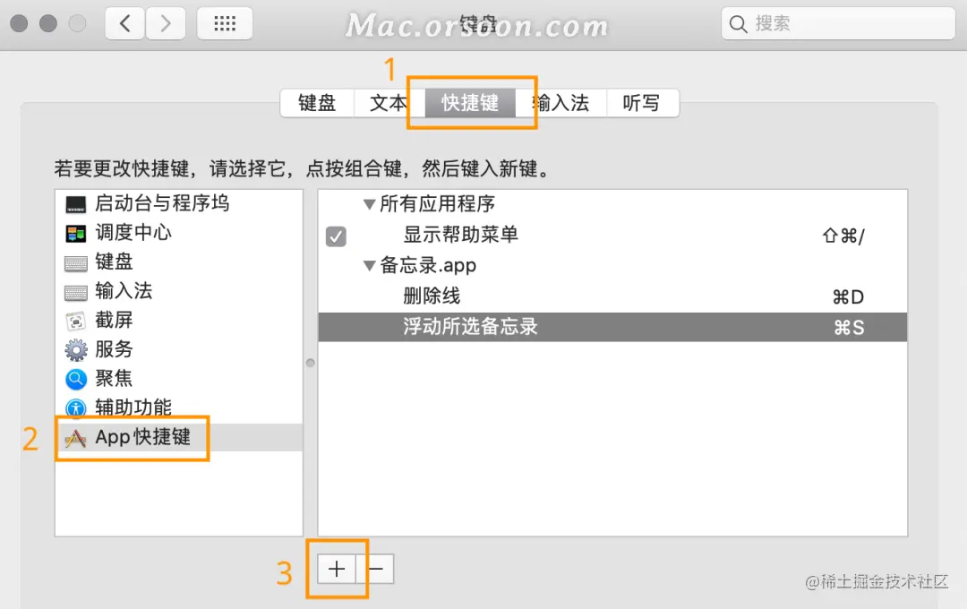 找到“快捷键”,再找到“App快捷键”,再点那个 + ,即可添加/修改快捷键。