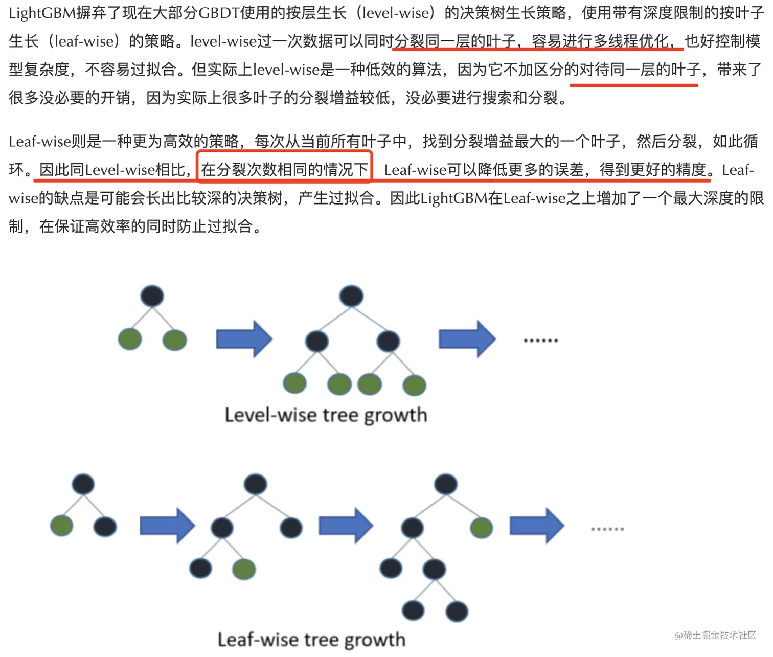 - lgb分裂叶子节点时是按层生长,leaf-wise,每次从当前所有层的叶子中找到分裂增益最大(一般也是数据量最大)的一个叶子,然后分裂,如此循环,有可能会生长出比较深的决策树(比如一直是),产生过拟合。 xgboost是每次判断该层左右哪个节点生长。