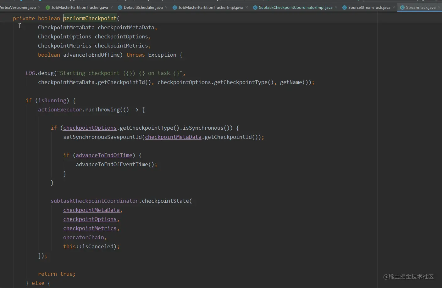 顺着上述的代码段,继续展开performCheckpoint方法,定位到checkpoint的关键执行函数SubtaskCheckpointCoordinator##checkpointState
