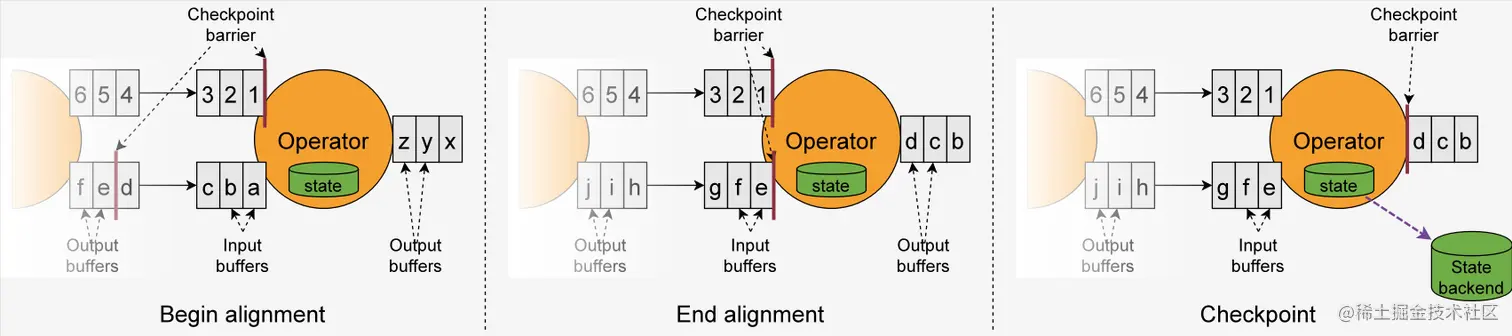 官方的解释为当作业图中的每个operator都收到这些障碍之一时,它会记录其状态。具有两个输入流(例如CoProcessFunction)的运算符执行屏障对齐,以便快照将反映由于消耗两个输入流中的事件直至(但不超过)两个屏障而导致的状态。