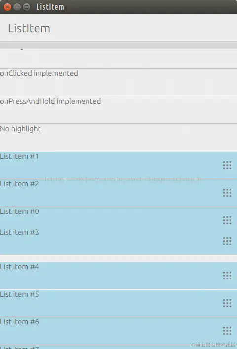 在应用的最后面,我们使用了一个ListView,并在ListView中使用ListItem。我们可以在ListView中长按列表中的内容,从而进入到可以drag-and-drop的模式,我们可以在列表中任意移动我们所需要的内容到我们想要的位置: