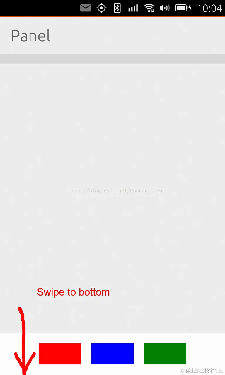 在这里,我们设计了一个简单的在屏幕下方的一个Panel。我们简单地在里面划了三个自己方块。当然,我们也可以放上自己的Control,虽然在Control上面滑动时不能隐藏Panel (需要点击在非Control的地方就像在API文档中介绍的那样)。我们的Panel在应用启动时已经打开了。就像API文档介绍的那样,一般情况下,我们会选择MainView中的toolbar来实现相应的功能。