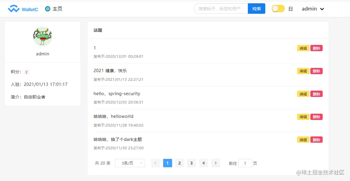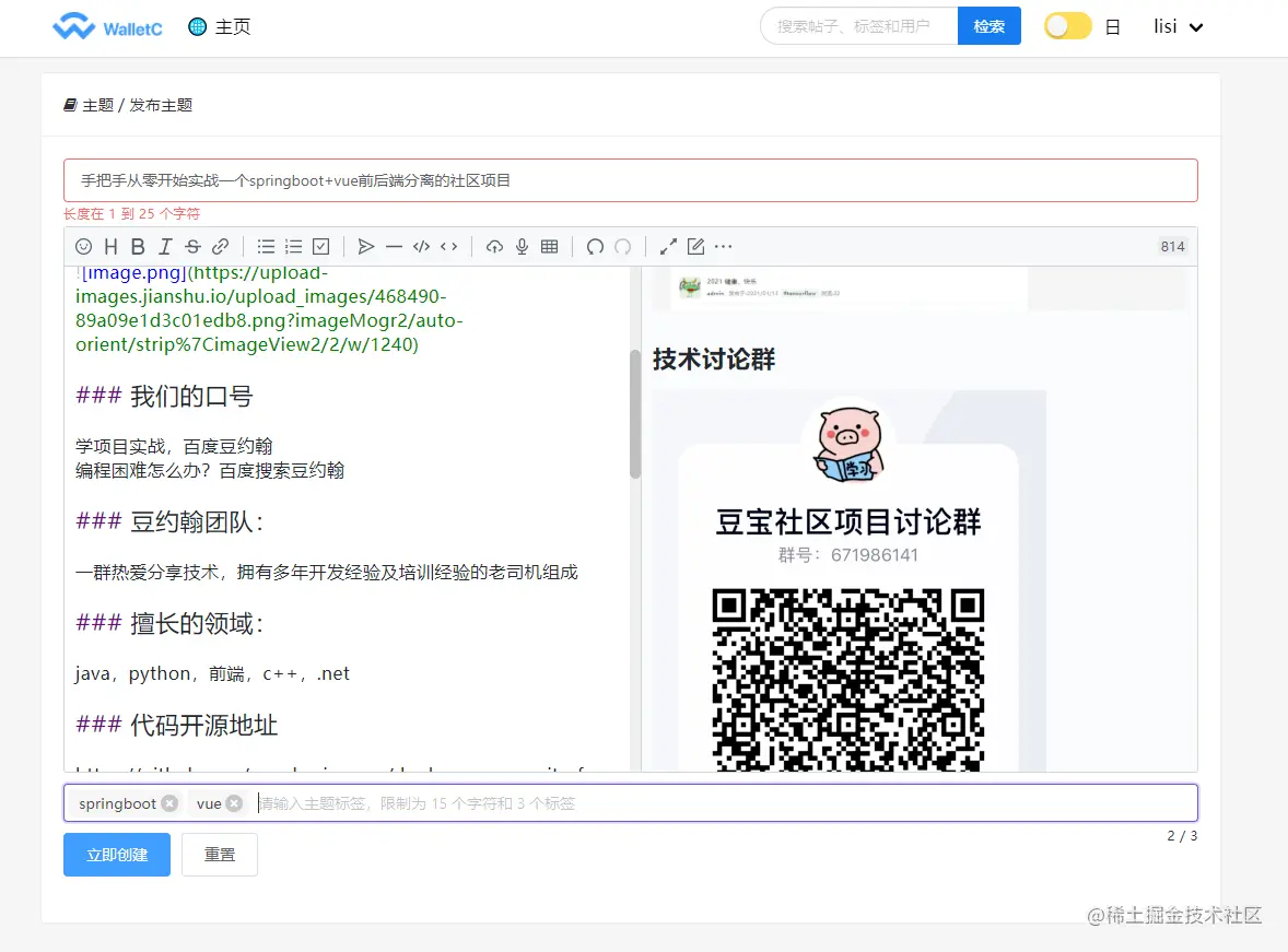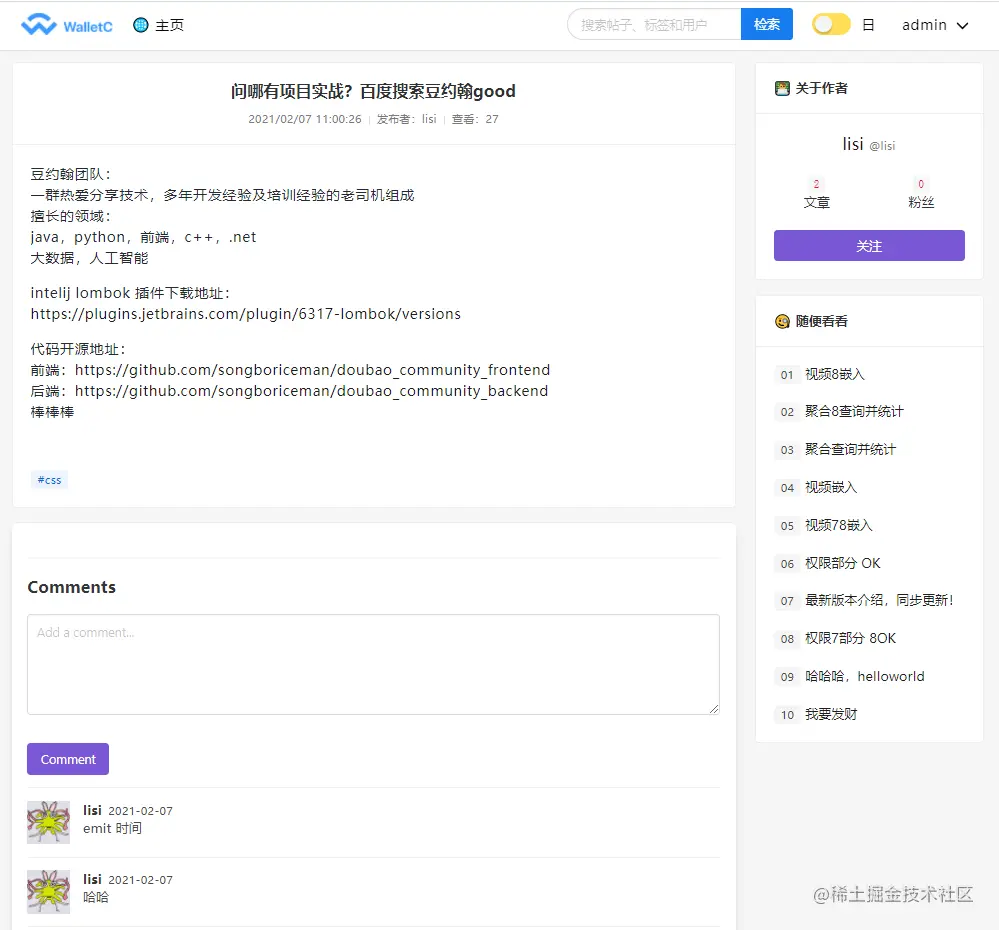 本项目类似一个简版的掘金这样的技术社区,实现了多个用户注册,登录,发帖,回帖,评论,关注,用户中心等功能。