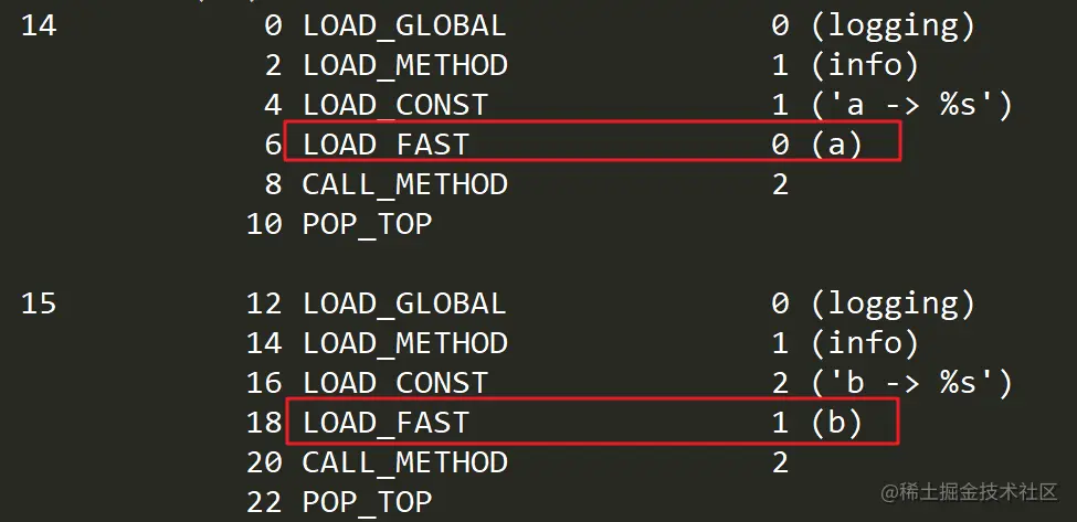 从字面码中可以看出,变量 a 与 b 都是从局部作用域(LOAD_FAST)中加载。而变量 b 在使用前没有被初始化,所以抛错。