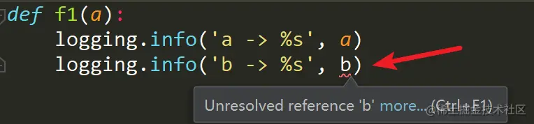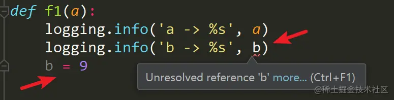 pycharm 也以红色波浪线提醒我们这里的 b 变量存在问题。