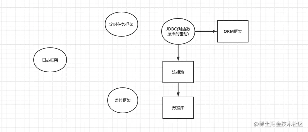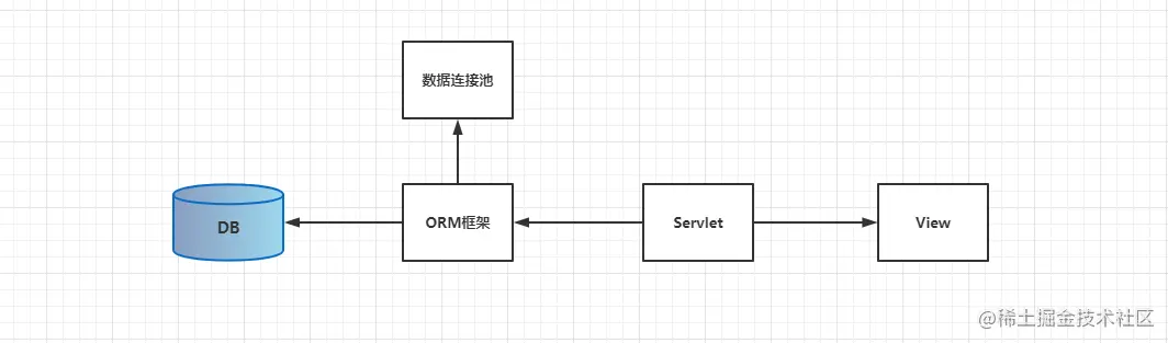 这是在减少模型层的代码量,但是目前整合ORM框架、连接池还是编码,整合的优劣受制于编写代码人的水平。现在我们引入的框架之后,我们的引入的框架之间的关系就变成了就变成了下面这样: