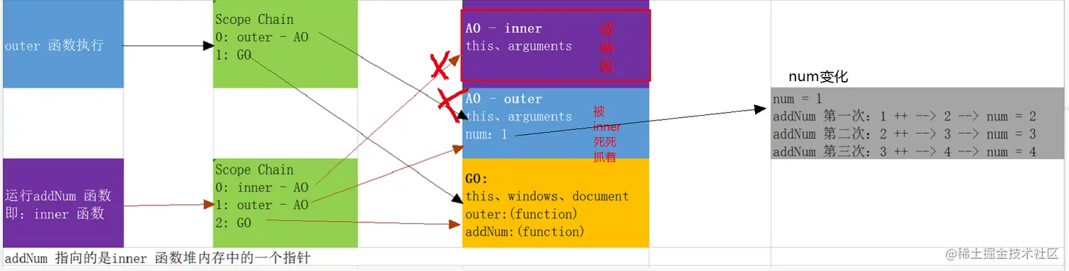 - 当内部函数被返回到外部并保存时,一定会产生闭包