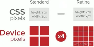 从上图中可以看出,原本一个像素,在显示的时候却用了两个物理像素,这就是物理像素比(实际显示的物理像素 / 指定的像素大小,上图中物理像素比就是4/2=2)
