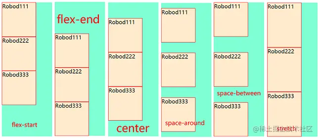 /* flex-start、flex-end、center、space-around、space-between、stretch*/