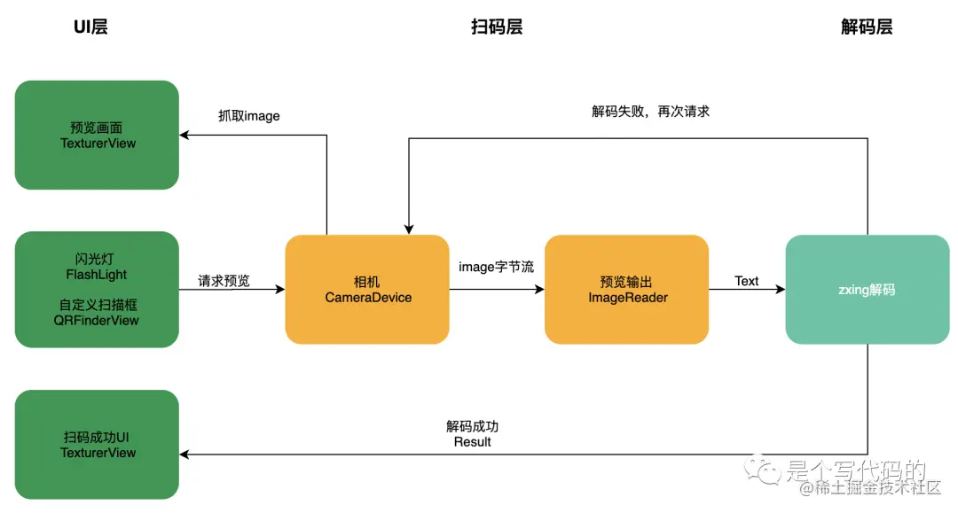 对项目中的扫码工具进行了camera到camera2的升级重构,解码部分仍然使用zxing库实现,下面是扫码工具的框架图。