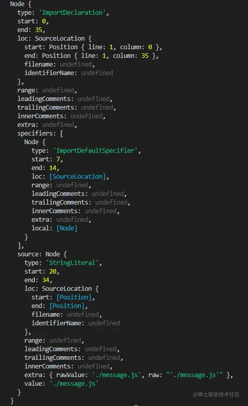 这次控制台又打印出了两个东西,这是program里的内容所对应的节点,第一个节点告诉我们,“这是一个引入”,正好对应我们index文件中的 import message from './message'这行代码,确实是一个引入;第二个节点告诉我们,“这是一个表达式”,正好对应我们index文件中的console.log(message)这行代码,确实是一个表达式