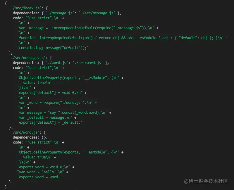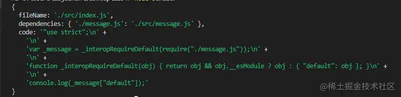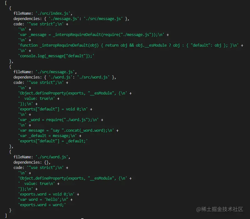 可以看到,打印出的代码已经不是我们之前在src目录下的代码了,而且经过翻译的代码,然后把上面的入口文件、依赖文件、还有代码三个字段返回,那么写到这里,恭喜你,我们对入口文件代码的分析就大功告成了!