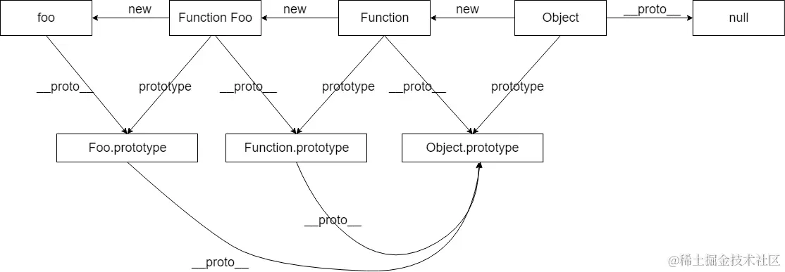 接下来就很好理解了,正因为函数是一等公民,函数是直接由Object创建出来的,而通过new Foo() 这样的方式创建出来的对象,其实是间接通过Object创建的,也就存在下面的关系链: