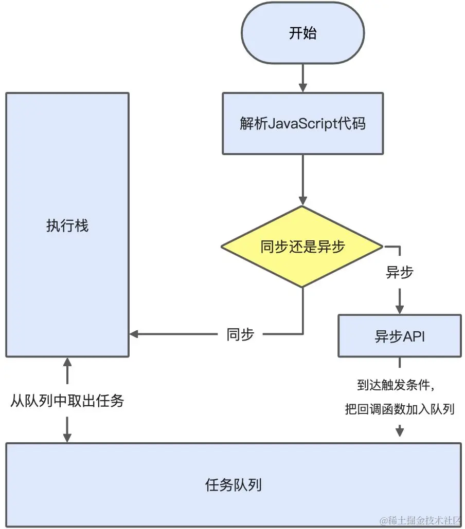 - 一开始时,JS引擎把同步代码放入执行栈中执行,而异步代码交给相应的线程或API处理,等到有结果或到达触发条件了,就把注册的回调函数放入异步任务队列中等待主线程取出执行