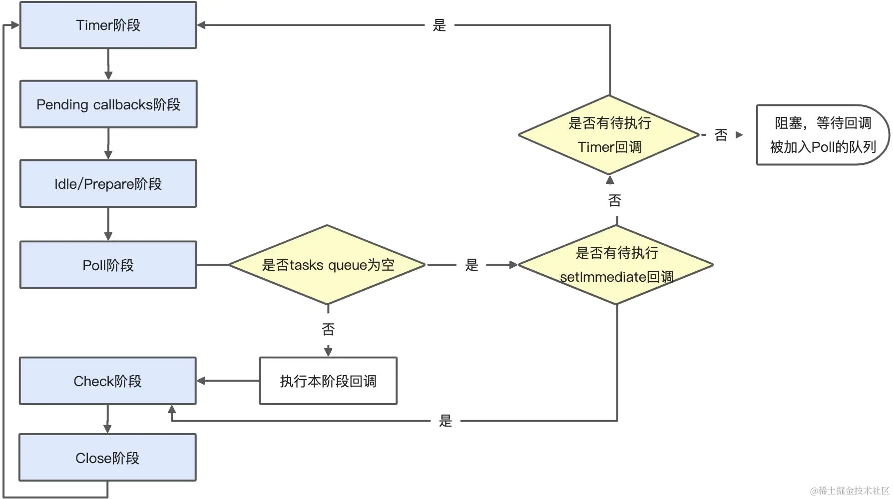 - NodeJS的Event Loop是基于libuv实现的。可以参考Node的官方文档以及libuv的官方文档。