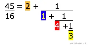 连分数不是一种新的数系,只是小数的另一种写法。例如可以把分数45除以16写成下面的形式