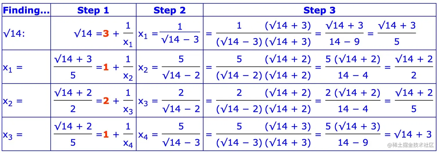 在这个网站中,作者以计算根号14的连分数为例,列出了一个表格