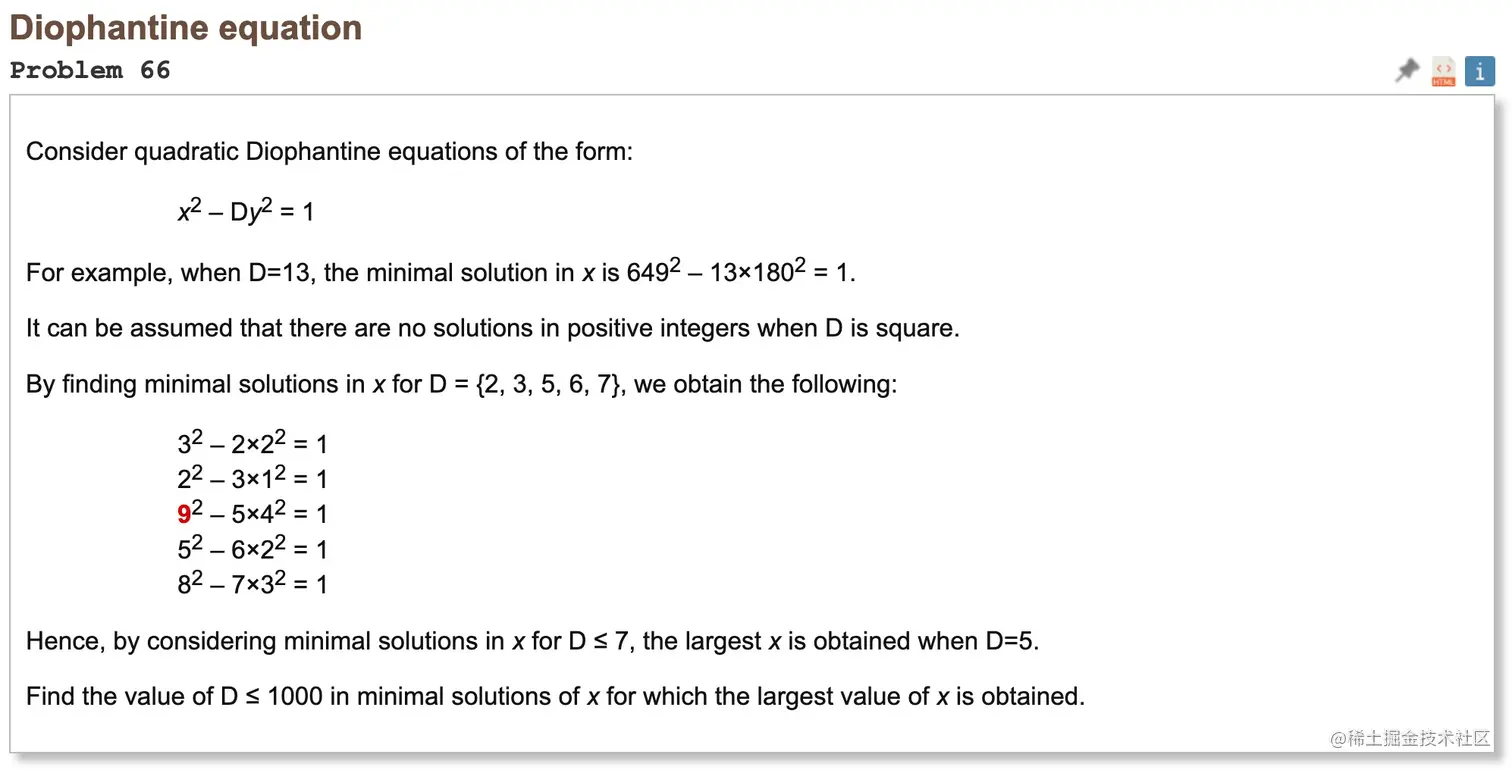 欧拉计划的第66题非常有意思,它的题目很简单,就是要求找出在不大于1000的整数中,以哪一个数字为丢番图方程的系数,可以得到所有最小解中的最大值。