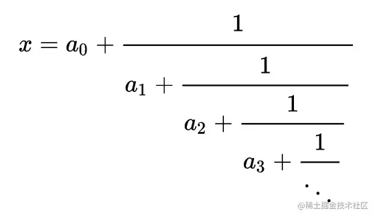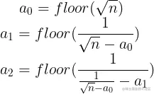要计算一个数字的连分数,最重要的便是要算出所有的整数部分(a0、a2、a2等)。它们都可以依据定义直接计算