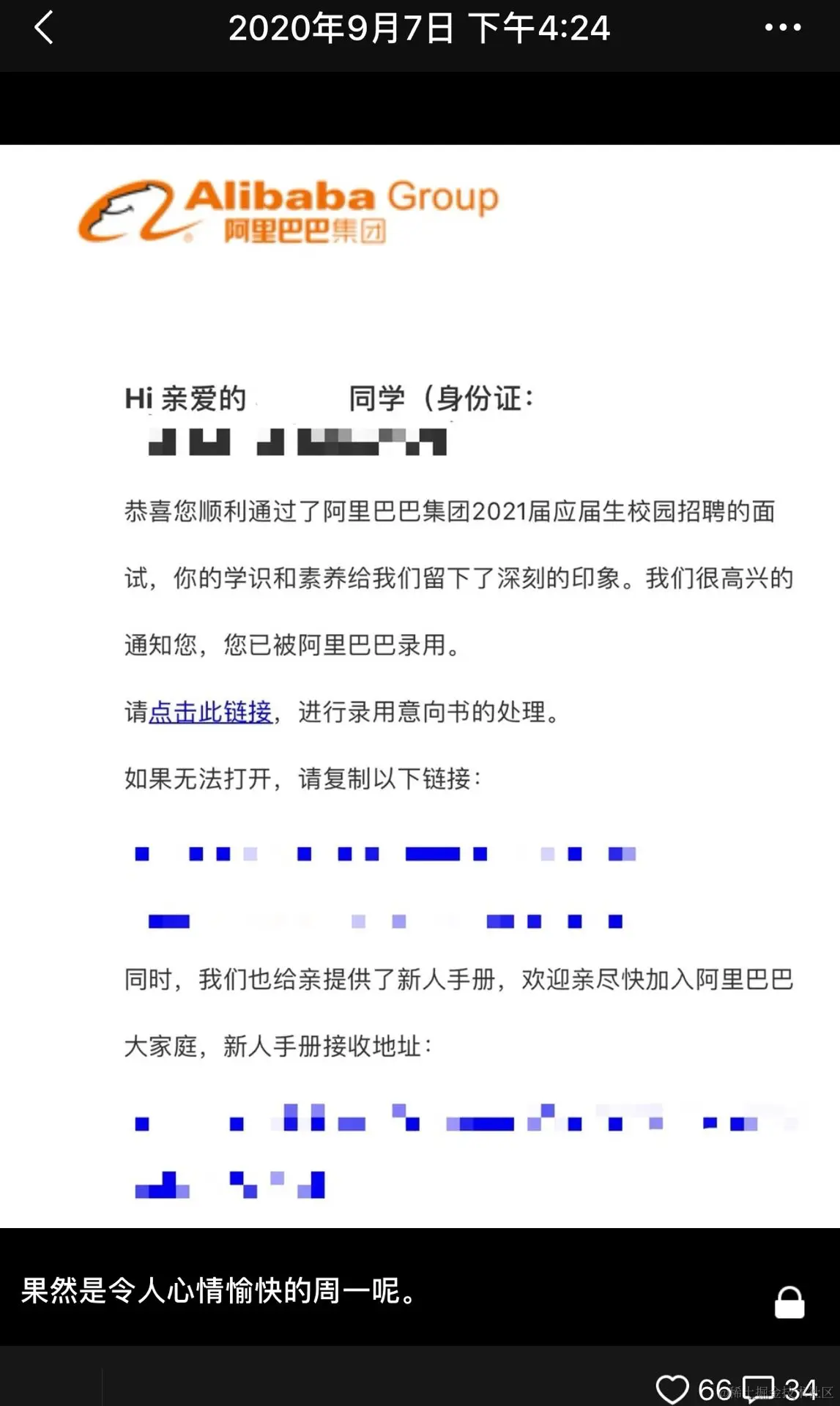 有一点难受的是每一轮面试之间相隔时间不定,电话也是随时打过来随时开始面试,所以那段时间内心非常煎熬,不知道熬过了多少个失眠的夜,所幸最终闯过七轮面试成功拿到Offer。