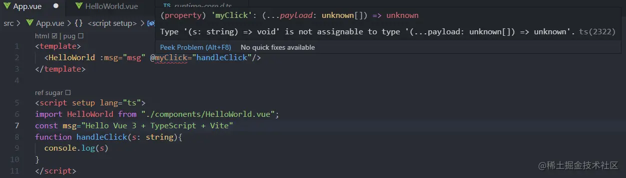 第一种方式传参使用简单,但是有一个问题,就是自定义事件方法的类型默认设置成 (...payload: unknown[]) => unknown 。导致在设置响应事件的方法也要定义成这个类型,不然ts就会提示类型不匹。