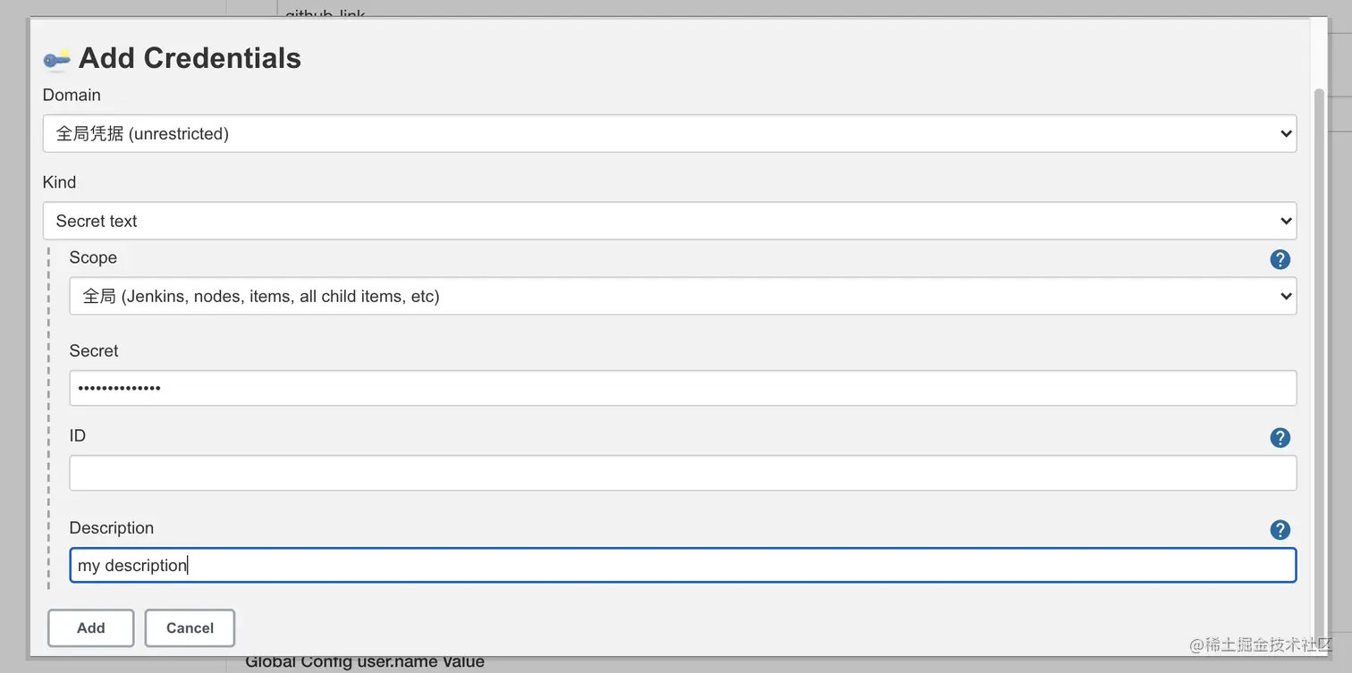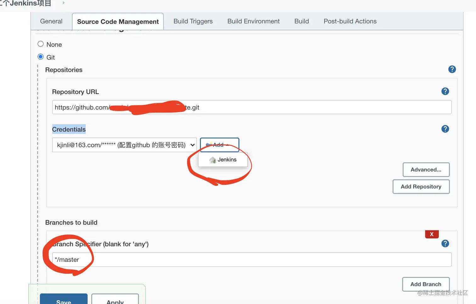 .git后缀结尾,用于Jenkins读取GitHub代码; - 配置凭证;