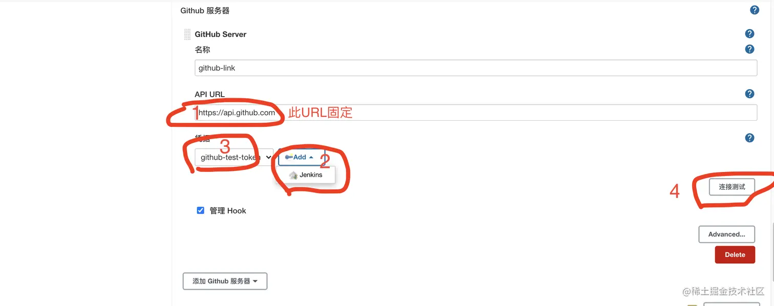 GitHub配置 配置URL时,固定的后缀github-webhookURL路径:http://ip(或域名):端口号/github-webhook/