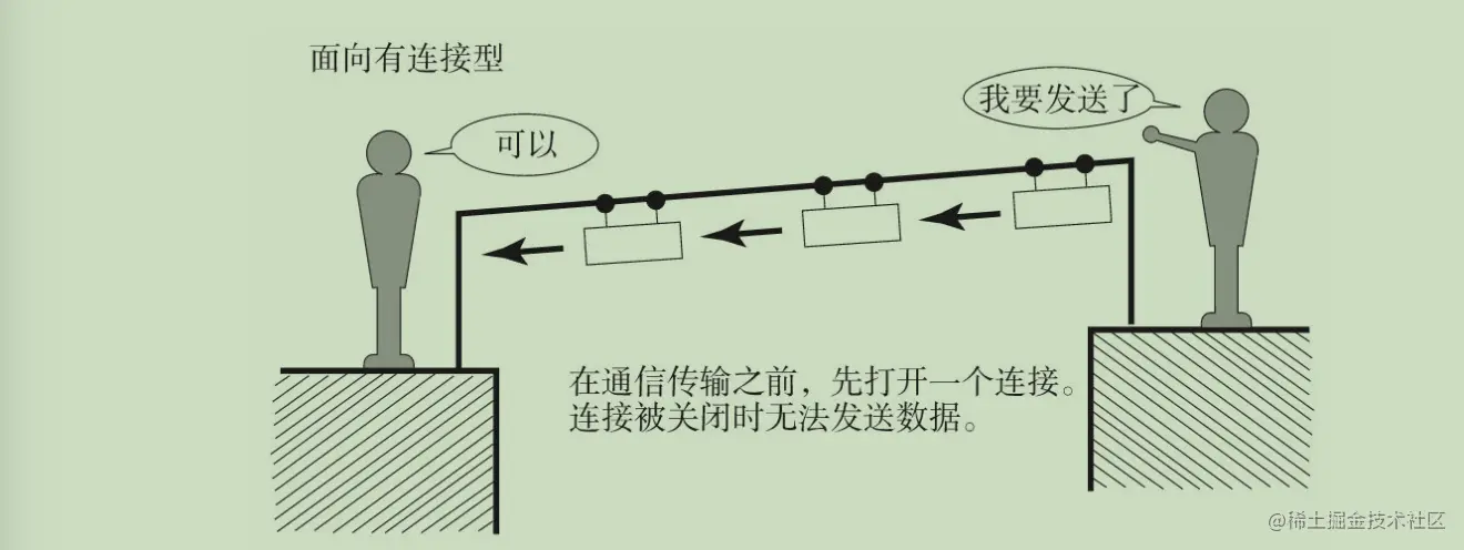 面向有连接型中,在发送数据之前,需要在收发主机之间连接一条通信线路 (在不同的分层协议中,连接的具体含义可能有所不同。在数据链路层中的连接,就是指物理的、通信线 路的连接。而传输层则负责创建与管理逻辑上的连接。)