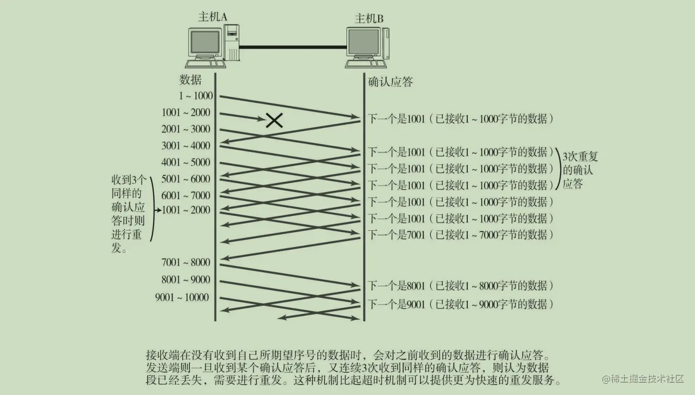 由重复确认应答而触发的高速重发与超时重发机制的处理多少有些不同。因为前者要求至少3次的确认 应答数据段到达对方主机后才会触发,相比后者网络的拥堵要轻一些。
