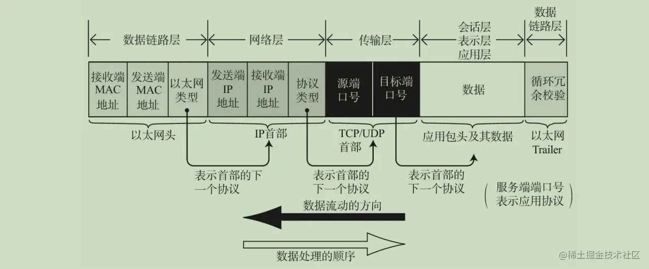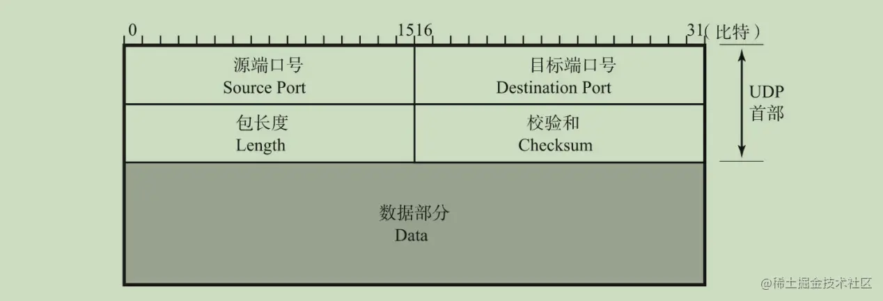 数据的部分正是UDP的首部。UDP首部由源端口号,目标端口号,包长和校验和组成。
