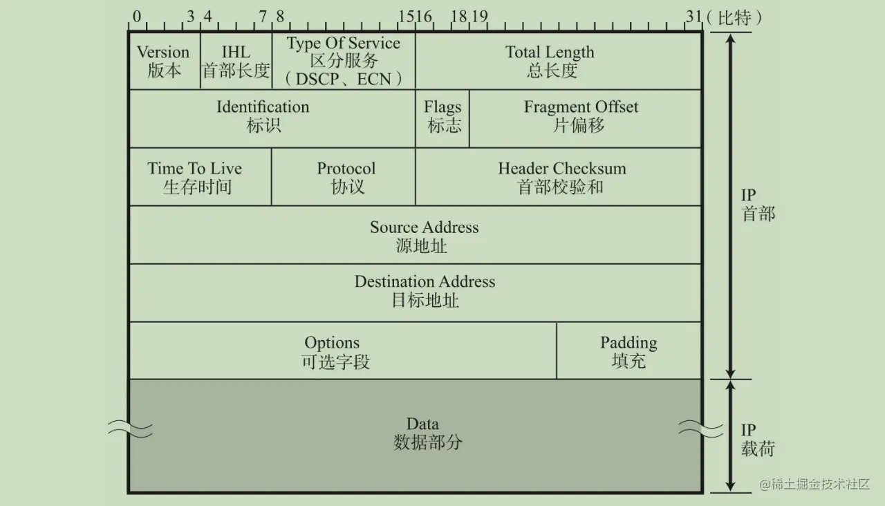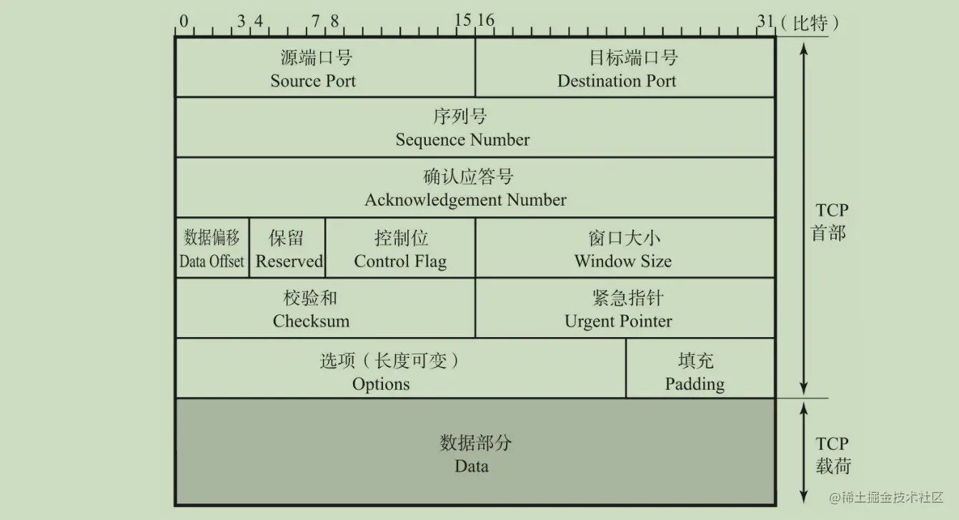 该字段表示TCP所传输的数据部分应该从TCP包的哪个位开始计算,当然也可以把它看作TCP首部的长 度。该字段长4位,单位为4字节(即32位)。不包括选项字段的话,TCP的首部为20字节长, 因此数据偏移字段可以设置为5。反之,如果该字段的值为5,那说明从TCP包的最一开始到20字节为止都 是TCP首部,余下的部分为TCP数据。