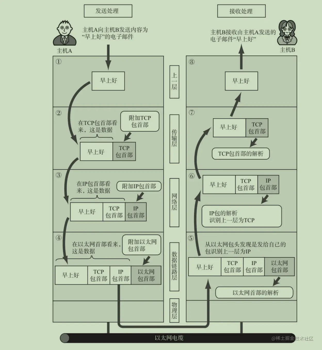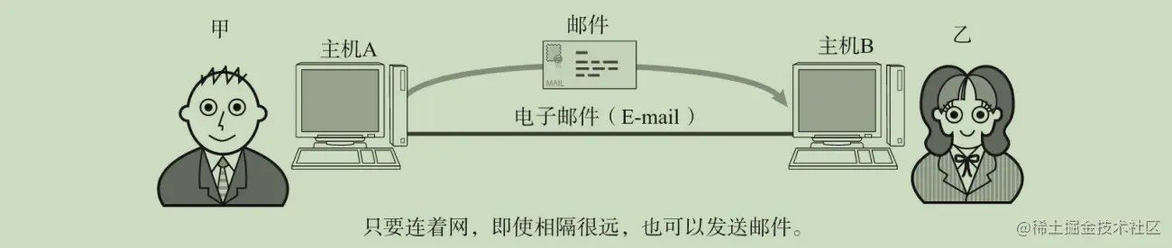 假设甲给乙发送电子邮件,内容为:“早上好”。而从TCP/IP通信上看,是从一台计算机A向另一台计算机B发送电子邮件。我们就通过这个例子来讲解一下TCP/IP通信的过程。