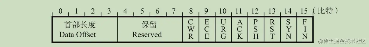 字段长为8位,每一位从左至右分别为CWR、ECE、URG、ACK、PSH、RST、SYN、FIN。这些控制 标志也叫做控制位。当它们对应位上的值为1时。