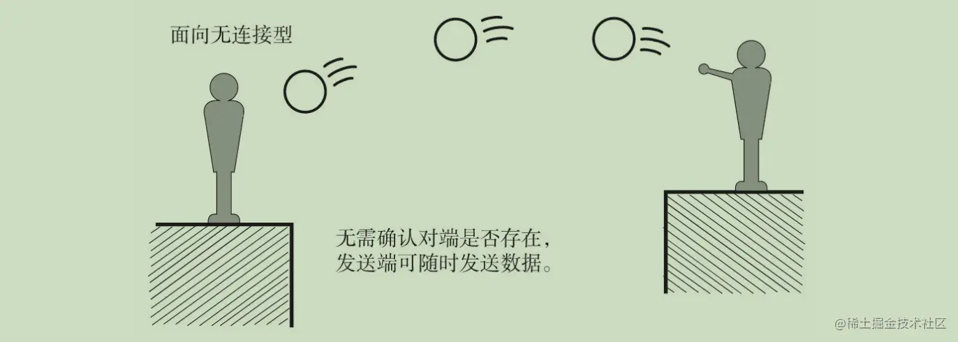因此,在面向无连接的通信中,不需要确认对端是否存在。即使接收端不存在或无法接收数据,发送 端也能将数据发送出去。