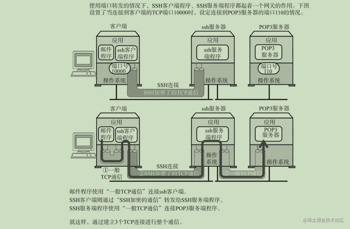 端口转发是指将特定端口号所收到的消息转发到特定的IP地址和端口号码的一种机制。由于经过SSH连 接的那部分内容被加密,确保了信息安全,提供了更为灵活的通信。