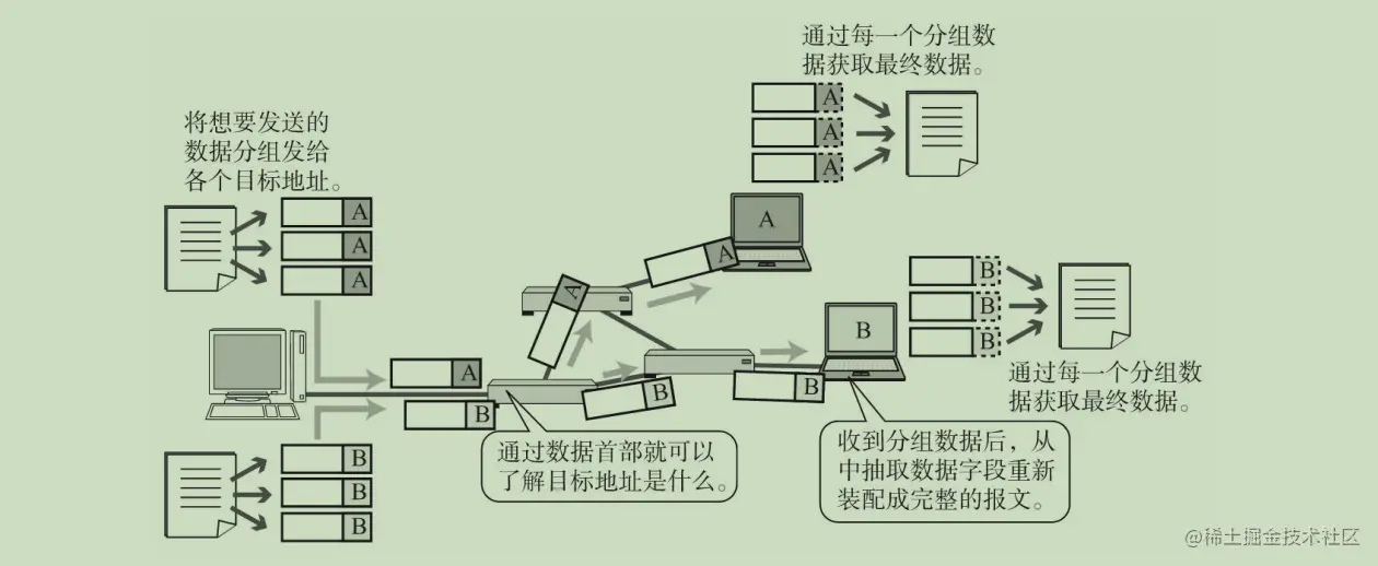 让连接到通信电路的计算机将所要发送的数据分成多个数据包, 按照一定的顺序排列之后分别发送。这就是分组交换。有了分组交换,数据被细分后,所有的计算机就可以一齐收发数据,这样也就提高了通信线路的利用率。由于在分组的过程中,已经在每个分组的首部写入 了发送端和接收端的地址,所以即使同一条线路同时为多个用户提供服务,也可以明确区分每个分组数据 发往的目的地,以及它是与哪台计算机进行的通信。