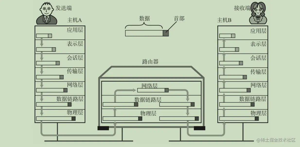 发送方从第7层、第6层到第1层由上至下按照顺 序传输数据,而接收端则从第1层、第2层到第7层由下至上向每个上一级分层传输数据。每个分层上,在处 理由上一层传过来的数据时可以附上当前分层的协议所必须的“首部”信息。然后接收端对收到的数据进行 数据“首部”与“内容”的分离,再转发给上一分层,并最终将发送端的数据恢复为原状。