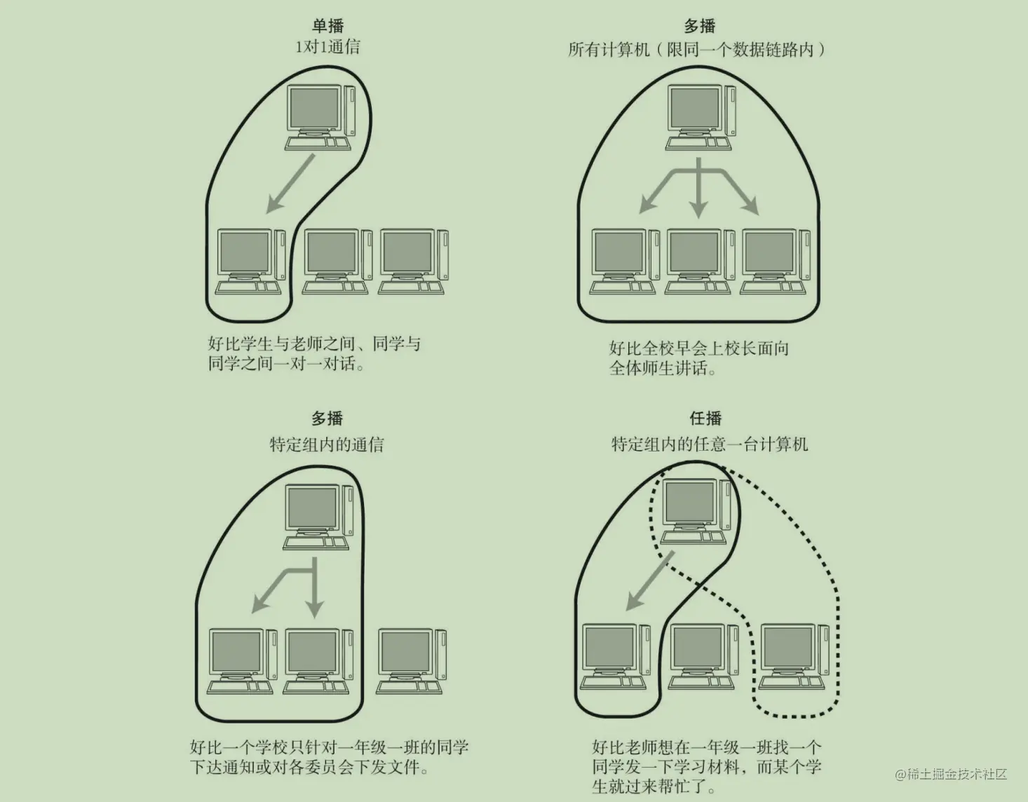 网络通信当中,也可以根据目标地址的个数及其后续的行为对通信进行分类。如广播、多播等就是这种分类的产物。