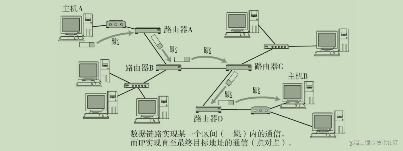IP还隐含着数据链路层的功能。通过IP,相互通信的主机之间不论经过怎样的底层数据链路都能够实现通信。