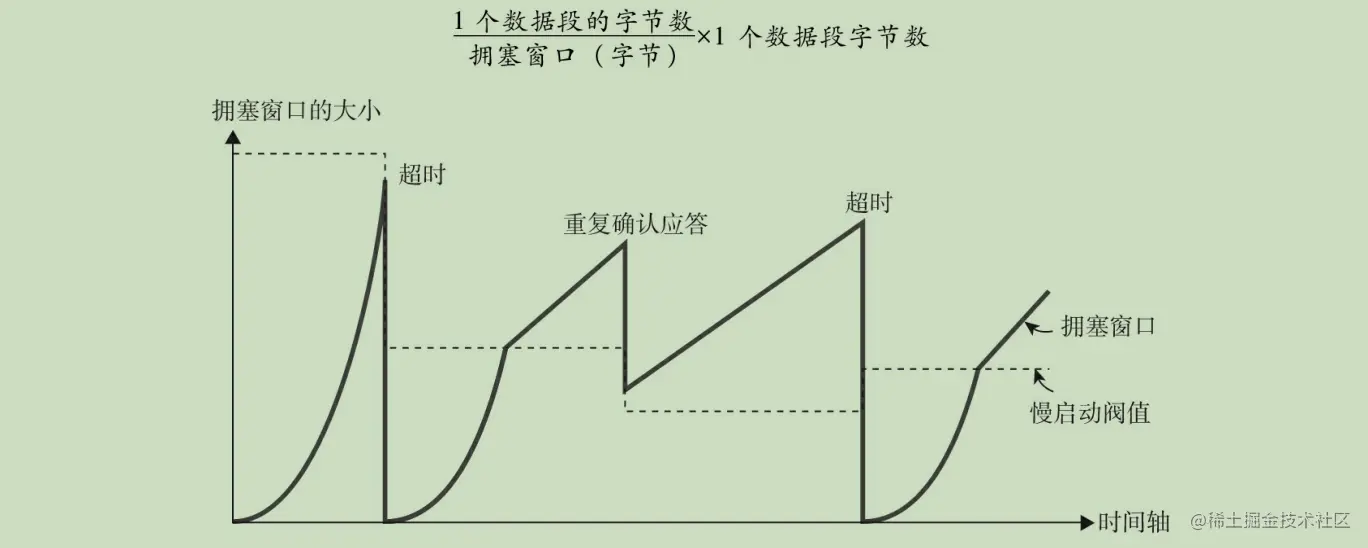 如果重发采用超时机制,那么拥塞窗口的初始值可以设置为1以后再进行慢启动修正。有了上述这些机 制,就可以有效地减少通信开始时连续发包【连续发包的情况也叫“爆发”【Burst】慢启动正是减少爆 发等网络拥堵情况的一种机制】 导致的网络拥堵,还可以避免网络拥塞情况的发生。 不过,随着包的每次往返,拥塞窗口也会以1、2、4等指数函数的增长,拥堵状况激增甚至导致网络拥 塞的发生。为了防止这些,引入了慢启动阀值的概念。只要拥塞窗口的值超出这个阀值,在每收到一次确 认应答时,只允许以下面这种比例放大拥塞窗口: