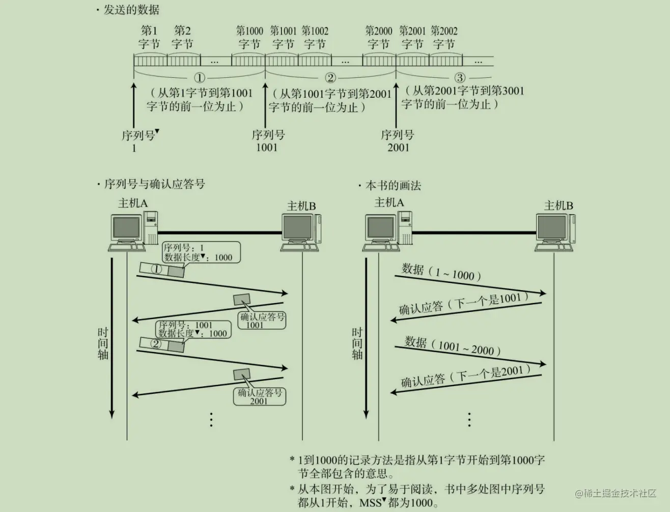 序列号不会从0或1开始,而是在建立连接时由计算机生成的随机数作为其初始值,通过SYN包传给接 收端主机。然后再将每转发过去的字节数累加到初始值上表示数据的位置。此外,在建立连接和断开连接 时发送的SYN包和FIN包虽然并不携带数据,但是也会作为一个字节增加对应的序列号。